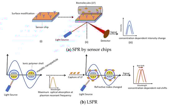 Lactoferrin detection by surface plasmon resonance (SPR) sensor. (a) SPR on sensor chips (i. Surface modification on sensor chips or gold nanoparticles; ii. The capture of lactoferrin on the surface was tested by laser beam; iii. Concentration dependent intensity change or red shift was recorded); (b) localized surface plasmon resonance (LSPR, the slight change of the refractive index of gold nano-shell after capture of lactoferrin results in the red shift of resonant frequency).
