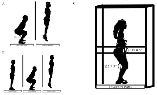 Upon completing the standardized warm-up, athletes were given two minutes of rest and then proceeded to vertical jump testing. The athletes performed squat jumps (SJ) followed by countermovement jumps (CMJ) (Figure 1). All jumps were completed on dual force plates (Rice Lake Weighing Systems, Rice Lake, WI, USA; 1000 Hz sampling rate) placed on a 91.4 cm × 91.4 cm custom built jumping platform [34]. For unweighted jumps, athletes placed a near weightless (<1 kg) polyvinyl chloride (PVC) pipe on their shoulders to eliminate the use of arm swing while jumping. For the weighted jumps, a 20 kg bar was used. Athletes were told to squat down to the “ready position,” a 90° knee angle measured with a handheld goniometer. After hearing the command of “3, 2, 1, jump!”, they gave a maximum effort jump. Warm-ups for SJ were performed at 50% and 75% perceived effort prior to at least two maximal effort jumps. The athletes then moved on to the CMJ test where they were instructed to stand still and await the command of “3, 2, 1, jump!” before descending to a self-selected depth and jumping. CMJ at 75% perceived effort preceded the two maximal effort trials with a 60 s rest in between. If the difference in jump height was greater than 2 cm, additional trials were performed.