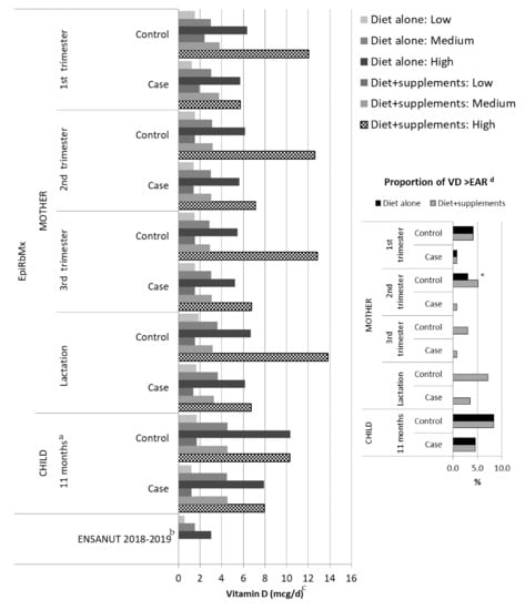 - Ochoa Correa, E.D.; García Hernández, P.A.; Villarreal Pérez, J.Z.; Treviño Garza, C.; Rodríguez Balderrama, I.; Martínez de Villarreal, L.E.; Zapata Castilleja, C.A.; De la OCavazos, M.E. Deficiencia de vitamina D en madres y neonatos mexicanos. Gac. Médica México 2017, 153. [Google Scholar] [CrossRef]