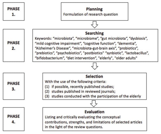 In the evaluation phase, the conceptual contributions, strengths, and limitations of selected articles were noted and critically evaluated in light of the review questions. This phase included studies concerning microbiome composition in cognition impairment (n = 6) and randomized controlled trials (RCT) studies concerning probiotic, prebiotic, and synbiotic intervention on cognition function (n = 12). It was relevant for this review to present the research results in a broad perspective, taking into account several larger issues (review of observational and interventional studies, the relationship between diet, the microbiome and cognitive disorders in the elderly, physiological mechanisms), but due to the small number of original studies and their heterogeneity, it was not possible to provide a systematic review. We aimed to provide a comprehensive view, showing the current state of knowledge, point out the errors and gaps, and the advancement of the research.