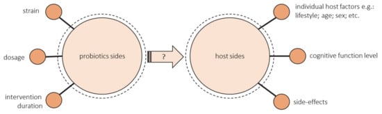 The discrepancy in these meta-analyses results suggests that there is too few data for unequivocal conclusions to be drawn. It needs to be highlighted that the number of studies assessing the effect of the probiotic intervention on cognitive function in elderly people is limited. Many unknowns still require clarification, and many parameters need to be controlled both from the probiotic and host sides when planning studies. The illustration of this issues is presented in Figure 2.