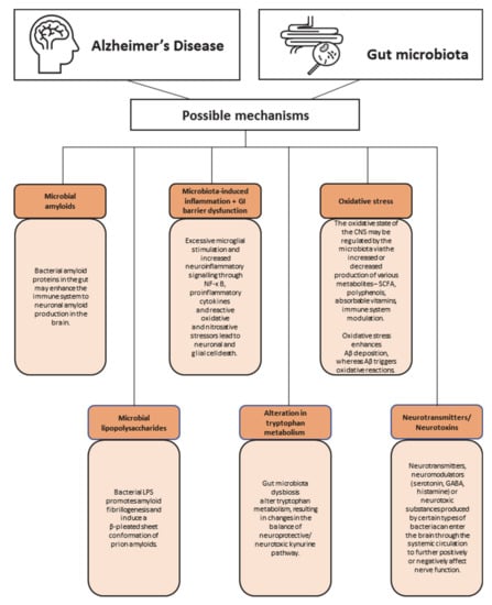 Another possible mechanism proposes that lipopolysaccharides (LPS) may play a role in AD. Recently, E. coli and B. fragilis have been shown to intensely produce proinflammatory lipopolysaccharides (LPS), which can access brain compartments by crossing the gastrointestinal tract (GI tract) and blood–brain barrier [129]. The LPS presence in the brain (hippocampus and neocortex) has been detected post-mortem in AD patients [129]. In addition, AD patients had a 3-fold higher plasma concentration of LPS compared to healthy people [129]. Furthermore, recent intervention animal studies showed that bacterial LPS may induce a β-structure of prion amyloids and promote amyloid fibrillogenesis. There is also the hypothesis of a vicious cycle that is responsible for the progression of AD [130]. The hypothesis assumes that LPS, by acting on leukocyte and microglial TLR4-CD14/TLR2 receptors, increases Aβ levels (via the increased level of cytokines), while Aβ1–42 is an agonist for TLR4 receptors [130]. An increased level of cytokines also leads to damage of oligodendrocytes and produces myelin injury in the AD brain [130].