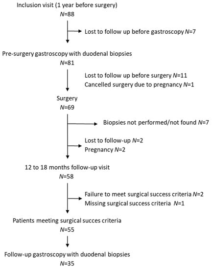 The flow diagram of the study is shown in Figure 1, fifty-five women meet the success of surgery criteria. 35 patients had complete follow-up with duodenal biopsies collected before and after SG. Analysis of the anthropometric characteristics at baseline (before surgery), showed high similarity of phenotype with the initial included cohort (N = 88) and the other analyzed groups (Table 1).