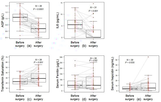 The inflammatory markers AGP and IL-6 levels significantly decreased after surgery (Figure 2a,b). The CRP was positive in 31 out of 49 patients (63.3%) before surgery and it remained positive only in 6 out of 42 patients (14.3%) after surgery (p < 0.001). Concentrations of B9 vitamin increased significantly after surgery whereas B12 levels were diminished (Table 2).