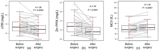For erythroid iron deficiency markers, both the mean of sTfR and Zn-PPIX levels were found significantly decreased after surgery (Figure 3a,b). This was consistent with significant decrease in the count of reticulocytes and the increase in MCV after surgery (73.5 versus 55.87 G/L, p = 0.008 and 85.22 versus 86.59 fL, p < 0.001, respectively, Table 2 and Figure 3c). Despite the surgery, hemoglobin levels, red blood cells and hematocrits counts were not significantly different over time (Table 2).
