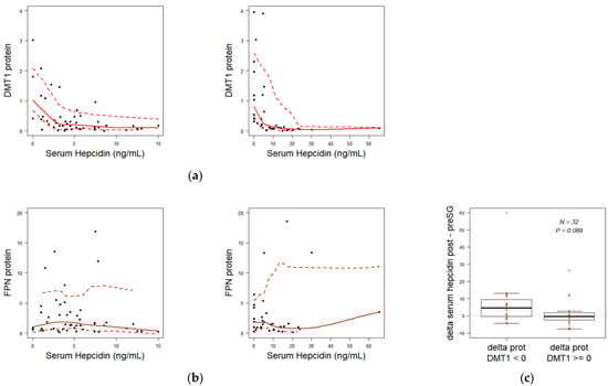 Paired comparison of duodenal iron transporters, FPN, DMT1, DcytB did not show significant differences in the mRNA abundance (FPN, DMT1, DcytB) and protein (DMT1 and FPN) (Supplementary data Figure S1). However, circulating hepcidin level was inversely correlated with DMT1 protein level (Figure 4a) but not with FPN abundance (Figure 4b), both before and after surgery. To better elucidate the effect of hepcidin on DMT1 protein, we compared variation rate of hepcidin in SG patients separated into two groups according to a criterion of DMT1 downregulation (17/32 patients) or not (15/32 patients). Patients who developed a downregulation of DMT1 following surgery, had also greater increase in their serum hepcidin level (delta post-/pre-surgery median reaching 4.5 ng/mL), while those who did not show a DMT1 decrease had an unchanged median variation of hepcidin level (close to 0 ng/mL) (Figure 4c).