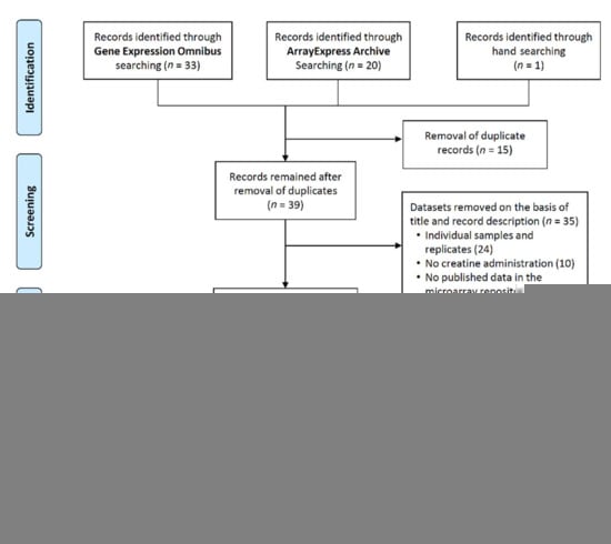 After retrieving the records using the Boolean algorithm, we obtained 33 datasets from the GEO database, 20 from the ArrayExpress Archive, and one from the hand searching process in Google Scholar. The expression data for one study that assessed changes in muscle transcriptome after Cr supplementation during knee immobilization in healthy young men [] was not published within a public repository (unsuccessful e-mail communication). After the assessment for inclusion criteria, only four records were suitable for eligibility, although one study was excluded from the analysis because a treatment combination with Cr, tacrine, and moclobemide was carried out. The overall procedure for data extraction is shown in the PRISMA flow chart (Figure 1).