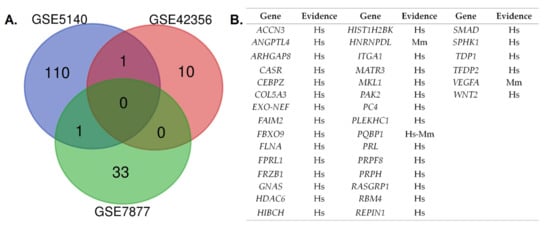 Convergent analysis of the differentially expressed genes obtained from the three datasets: (A) Venn diagram comparing differentially expressed genes identified in the included datasets (adjusted p < 0.05); (B) list of genes derived from the convergent functional genomics analysis in human and mouse models. Hs: Homo sapiens; Mm: Mus musculus.