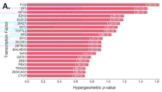 The functional annotation of the 35 selected differentially expressed genes after CrM administration showed that these are involved in anti-apoptotic processes, cell differentiation, and positive regulation of protein phosphorylation cascades. It must be noted that these genes perform functions throughout the cell (nuclear origin of replication recognition complex (nucleus), U5 snRNP (transcription complex), and endosome lumen (vesicles)) through either receptor activation and secondary messengers (G-protein-coupled receptor binding, Rac GTPase binding, and polyubiquitin modification-dependent protein binding) or direct regulation of de novo biosynthesis (miRNA binding and pre-mRNA binding) (Table 2). After transcription factor enrichment analysis, the proteins that most likely regulate the observed changes in gene expression after Cr administration are involved in cell survival, apoptosis, proliferation, differentiation, migration, and the cytoskeletal structure. To highlight this, among the top ranked transcription factors (Figure 3A) of our analysis we found: (i) FOS is a G0/G1 switch regulatory protein that heterodimerizes with members of the JUN family of transcription factors to form AP-1 complexes and regulate signal transduction, cell proliferation, and differentiation []; (ii) SP1 was the first to be cloned and characterized of the specificity protein–Krüppel-like factor (Sp/KLF) family of transcription factors, which are involved in multitude of cellular pathways and processes by regulating tissue- and developmental-stage-specific gene expression []; (iii) NFYA is one of the three subunits of a highly conserved and ubiquitously expressed heterotrimeric transcription factor that regulate gene expression at promoter regions []; (iv) EZH2 and SUZ12 are essential for the integrity of the polycomb group complexes, the expression of which rises at the G1/S phase transition [,]; (v) ZMIZ1 regulates the activity of various transcription factors, including the androgen receptor, Smad3/4, and p53 []; and (vi) MYC is implicated in cell growth [], proliferation, differentiation [], and cellular adhesion and migration [,], and may dimerize with MAX to bind DNA and exert its effects [].