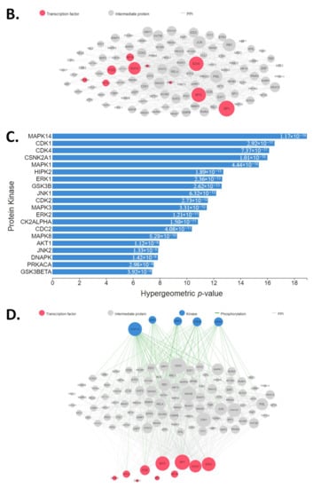We utilized the differentially expressed genes from the CFG analysis to infer the upstream regulatory networks using the computational pipeline of the eXpression2Kinases (X2K) Web (freely available at https://amp.pharm.mssm.edu/X2K/, accessed on 12 May 2021) []. X2K Web is an enhanced algorithm that performs an enrichment analysis to prioritize transcription factors that most likely regulate the observed changes in mRNA expression (ChEA and PWM), which was previously validated by Chen et al. []. It then utilizes known protein–protein interactions (PPIs) to connect the identified transcription factors to form a subnetwork. Finally, kinase enrichment analysis (KEA) is performed to prioritize protein kinases known to phosphorylate substrates within the subnetwork of transcription factors and the intermediate proteins that connect them. Top kinases and regulatory proteins (ranked by hypergeometric p-values, which indicate unusual differential expression in the database) were contrasted to individual low-throughput experimental reports available in the literature.