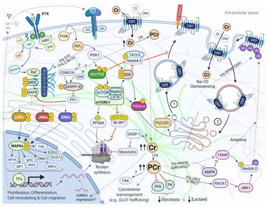 Bioinformatics- and knowledge-based pathway reconstruction after Cr supplementation. This is a representation of pathways interactions based on the results of our enrichment analysis of differentially expressed genes after increasing cellular Cr concentration and the available experimental evidence. This functional network follows the ‘bio-logic’ (integration of bottom-up and top-down directions) of the genotype–outcome interaction. MAPK activation can occur via osmosensing pathways that activate Ras/Raf (e.g., S1P/SPHK1) and mechanosensing pathways that involve mechanical and energy optimization of the cytoskeleton (e.g., Four-and-a-Half Lim 2 is an important mechanosensor that triggers hypertrophy in response to strain and also docks key metabolic enzymes involved in the energy transduction process, such as M-CK, adenylate kinase, and phosphofructokinase). Several subunits of the protein complexes and the architecture of the cytoskeleton are not depicted for readability. We cautiously suggest two dose–response functional pathways for the regulation of the Cr uptake: a kinase-driven mechanism as a result of the initial Cr-enriched environment, which is more related to the anterograde trafficking via endolysosome-specific phosphoinositide compounds (1); and a ubiquitin-driven mechanism that controls the excessive Cr uptake, which is more related to the retrograde trafficking via clathrin-dependent and clathrin-independent processes (2). Interlinking protein filaments of the cytoskeleton are represented with lighter-colored lines in the background. See the sections of the manuscript for rationale, citations, and more abbreviations. Dashed arrows represent multiple steps. AMPK: AMP-activated protein kinase; CK: creatine kinase; GASP-1: growth and differentiation factor (GDF)-associated serum protein-1; GDP: guanosine diphosphate; GH: growth hormone; GLUT: glucose transporter; GRB2: growth factor receptor-bound protein 2; GTP: guanosine triphosphate; IGF-1: insulin-like growth factor-1; LST8: target of rapamycin complex subunit LST8; MRFs: myogenic regulatory factors; Nedd4-2: E3 ubiquitin–protein ligase NEDD4-like; OSR1: oxidative-stress-responsive kinase 1; PDK1: phosphoinositide-dependent kinase-1; PFK: phosphofructokinase; PI(3,5)P2: phosphatidylinositol 3,5-bisphosphate; PIKfyve: 1-phosphatidylinositol 3-phosphate 5-kinase; PI3K: phosphoinositide 3-kinase; PIP3: phosphatidylinositol (3,4,5)-trisphosphate; PK: pyruvate kinase; SGK: serum- and glucocorticoid-regulated kinase; SPAK: SPS1-related proline–alanine-rich kinase; RACK1: receptor for activated C kinase 1; RTK: receptor tyrosine kinases; TFs: transcription factors. Source: created by the authors (D.A.B.) with BioRender—https://biorender.com/ (accessed on 10 May 2021).
