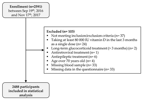 A total of 2591 participants were enrolled in the study. Serum 25(OH)D concentration was determined for 2558 individuals (33 missing blood samples), 33 (1.3%) did not fill out the questionnaire, and 37 (1.4%) were excluded because they met an exclusion criterion. Therefore, a total of 2488 participants were included in the analysis (Figure 1). Among the 2488 participants, 1513 (60.8%) were female, and information on body mass index (BMI) was available for 2473 participants: 674/2473 (27.3%) were considered as overweight (25 ≤ BMI < 30), and 418/2473 (16.9%) were considered as obese (BMI ≥ 30). Regarding skin phenotype, 1631/2475 (65.9%) participants had a light-colored skin (type I to III). A total of 525 (21.1%) participants took at least one vitamin D-supplemented product in the last 12 months, and 321 (12.9%) had had a vitamin D supplementation in the last 12 months (regular treatments with tablets or singles doses of at least 80,000 IU taken more than 3 months prior to study entry). A total of 461/2474 (18.6%) responders reported smoking, 1266 (50.9%) reported practicing sports, and 958 (38.5%) reported a “significant sun exposure” during holidays over the last 12 months (Table 1).