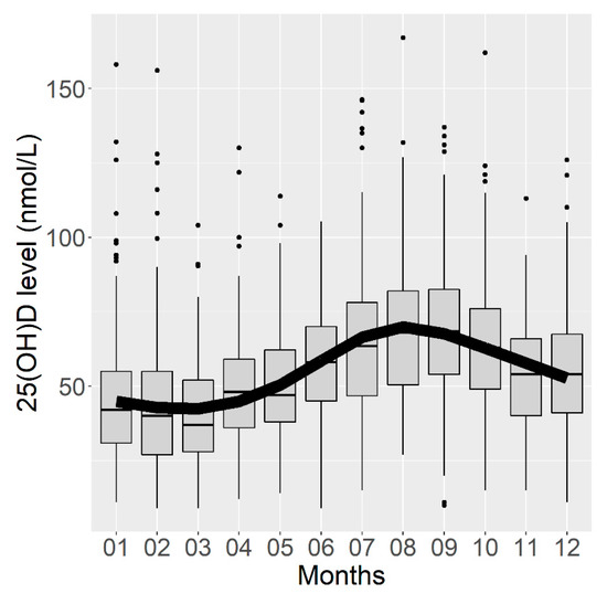 The analysis of serum 25(OH)D concentrations by month of blood sampling confirmed the seasonality of the vitamin D concentration, which was the highest in August and September and the lowest concentration in February and March (Figure 2). The corrected R2 of this first model was estimated at 0.161 (95% CI (0.122; 0.192)), meaning that 16.1% of the variance in the vitamin D concentration could be explained by the month of blood sampling.