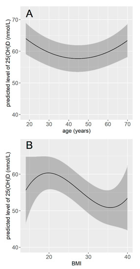 The multivariable linear regression model included 12 variables, which were the 11 variables retained from the bivariate analyses plus the seasonality. The intercept for each month showed that participants whose serum was sampled in March had vitamin D values on average 27 nmol/L lower than those whose serum was sampled in August. Regarding other variables, being a man, current smoker, unemployed, having a dark skin phototype, no vitamin D supplementation in the last 12 months, no significant exposure during holidays over the last 12 months, a lower cumulative sun exposure over the last week, no sporting activities (either outdoor or indoor), and living in the North were significantly associated with a lower vitamin concentration. The vitamin D concentration was also significantly associated with age and BMI, but these associations were not linear (Table 3). The vitamin D concentration tended to decrease with age until 40–50 years and to be higher for older age classes. It tended to be maximal for BMI values around 20 and lower for values below and above 20 (Figure 3). Participants with dark skin (type V and VI) had serum vitamin D concentration 15.37 nmol/L lower than participants with light-colored skin (type I to III), and participants with tanned skin (type IV) had serum vitamin D concentration 1.95 nmol/L lower than participants with light-colored skin (type I to III). Smokers had vitamin D concentration on average 3.75 nmol/L lower than non-smokers, and unemployed participants had vitamin D concentration 2.02 nmol/L lower than participants who were either employed or retired. Participants who had no significant sun exposure during holidays over the preceding 12 months had vitamin D concentration 8.01 nmol/L lower than participants who had, and participants who practiced any sport had vitamin D concentration on average 3.89 nmol/L higher than those who did not (Table 3). Overall, the final model explained 28% of the total variance in vitamin D concentration (0.282, 95% CI (0.238; 0.324)).