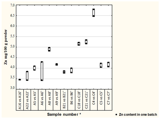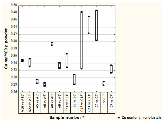 Differences in Cu and Zn concentrations between two batches in thirteen formulae are illustrated in Figure 1 and Figure 2. In most of the analyzed samples, the concentration of Cu and Zn in different batches were satisfactory (19% difference was adopted) [17], median (1st–3rd quartile), Cu—0.33 (0.29–0.39) and Zn—4.13 (3.83–4.97); however, in one formula the Cu concentration difference was 33%.