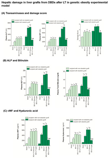 Effects of glucose and lipids on hepatic damage in steatotic and non-steatotic Liver transplantation (LT) in a genetic obesity experimental model. (A) AST and ALT in plasma, and damage score in liver. (B) alkaline phosphatase (ALP) and bilirubin in plasma. (C) von Willebrand factor (vWF) and hyaluronic acid in plasma. * p < 0.05 vs. Sham. + p < 0.05 vs. LT. # p < 0.05 vs. Brian death +Liver Transplantation (BD + LT). DBD, Donors after Brain death.
