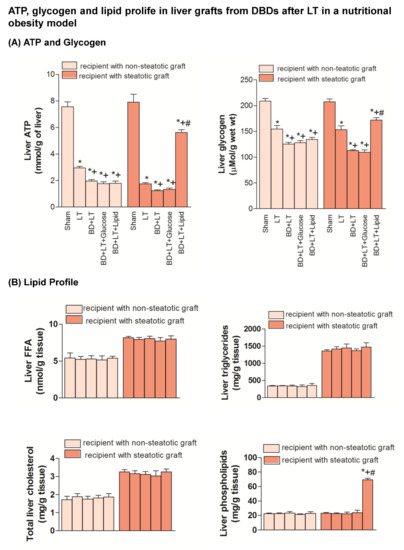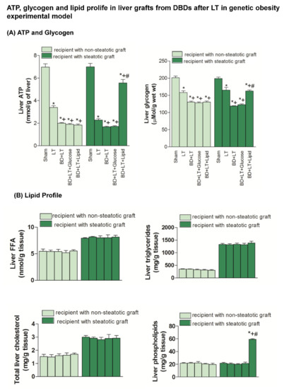 Effects of glucose and lipids on ATP, glycogen and lipid profile in steatotic and non-steatotic Liver Transplantation (LT) in a genetic obesity experimental model. (A) ATP and glycogen content in liver. (B) FFA, triglycerides, total cholesterol and phospholipids in liver. * p < 0.05 vs. Sham. + p < 0.05 vs. Liver Transplantation (LT). # p < 0.05 vs. Brain Death+Liver Transplantation (BD + LT). DBD, Donors after Brain death.