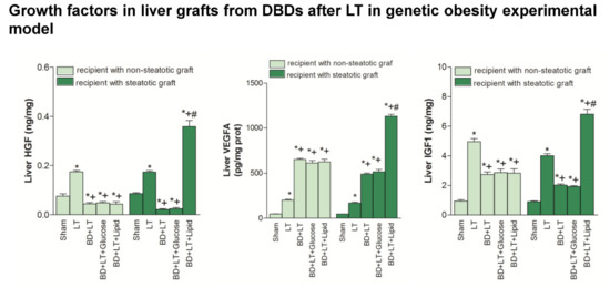 Effects of glucose and lipids on growth factors in steatotic and non-steatotic LT in a genetic obesity experimental model. HGF, VEGFA and IGF1 in liver. * p < 0.05 vs. Sham. + p < 0.05 vs. Liver Transplantation (LT). # p < 0.05 vs. Bran Death+Liver Transplantation (BD + LT). DBD, Donors after Brain death.