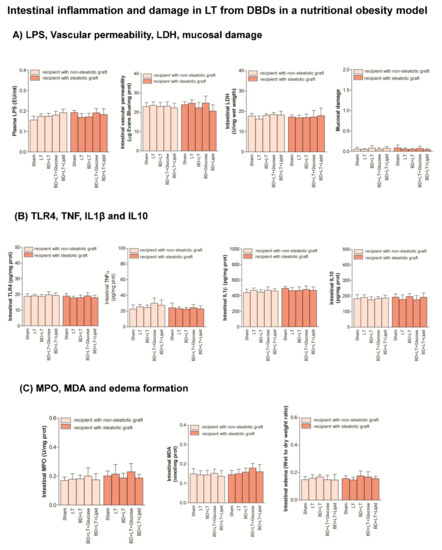 Effects of glucose and lipids on intestinal inflammation and damage in steatotic and non-steatotic LT in a nutritional obesity model. (A) LPS in plasma and vascular permeability, Lactate dehydrogenase (LDH) and mucosal damage in intestine. (B) Toll like Receptor 4 (TLR4), Tumor necrosis factor (TNF), Interleukin (IL)1β and Interleukin (IL)10 in intestine. (C) Myeloperoxidaase (MPO), Malondialdeyde MDA and edema formation in intestine. Sham vs. LT or BD + LT, p = not significant; LT vs. BD + LT, p = not significant. DBD, Donors after Brain death.