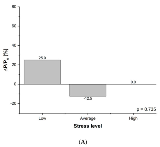 (A) Difference in stress level initially and after three months of intervention in group A: P, percentage of the group; ΔP = PAfter − Pbefore; Po = Pbefore; ΔP/Po relative change of percentage of the group (during experiment). (B) Difference in stress level initially and after three months of intervention in group B: P, percentage of the group; ΔP = PAfter − Pbefore; Po = Pbefore; ΔP/Po relative change of percentage of the group (during experiment).