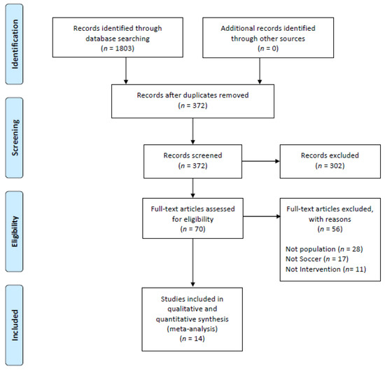 The flow diagram in Figure 1 shows the selection process. From a total of 1803 articles, 372 remained after eliminating duplicates. Then, 302 publications were removed because they did not meet the eligibility criteria. Full-text papers (n = 70) were assessed for eligibility, with 56 of these being removed for multiple reasons. Finally, 14 studies were included [31,32,33,34,35,36,37,38,39,40,41,42,43,44]. In total, 1643 subjects were evaluated. Table 1 shows the general characteristics of the studies participants. Table 2 and Table 3 show the concrete characteristics and their football intervention.