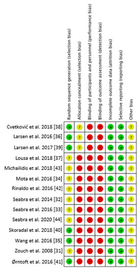 The following variables were abstracted into a preformatted spreadsheet: authors, year of publication, and characteristics of study participants (n, age, % females, sport, BMI). Data extraction, quality assessment, and risk of bias were performed independently and in duplicate by two investigators (A.M.) and (J.S.), applying the PEDro Scale according to previous research [26]. Discrepancies were solved by consensus consulting with an independent third reviewer (L.G.) in accordance with the Cochrane Collaboration guidelines [27].