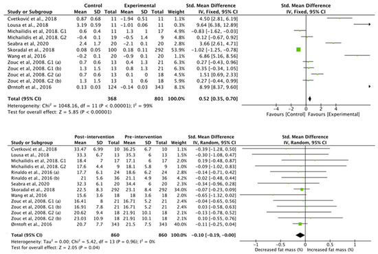 Results of random effects meta-analysis for the control group compared with the experimental group and results post and pre intervention, shown as mean difference and standardized mean difference with 95% CIs for fat mass [31,35,37,38,40,41,42,43,44].