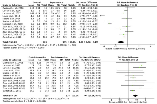 Results of a random effects meta-analysis for control group compared with experimental group and results post and pre intervention, shown as mean difference and standardized mean difference with 95% CIs for lean body mass [31,32,33,36,37,38,39,40,41].