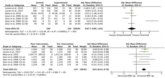 Results of random effects meta-analysis for the control group compared with the experimental group and results post- and pre-intervention, shown as mean difference and standardized mean difference with 95% CIs for bone mineral content [31,34,36,39].