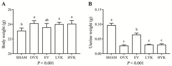 Body (A) and uterine (B) weights in mice that were sham operated or ovariectomized and untreated or administered EV, LVK, or HVK for 12 weeks. Values are mean ± SD, n = 8–10 per treatment. Labeled without a common letter means a significant difference, p < 0.05. EV, estradiol valerate; HVK; MK-4 40 mg/kg body weight group; LVK, MK-4 20 mg/kg body weight group; MK-4, menaquinone-4; OVX, ovariectomized group; SD, standard deviation.