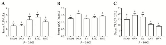 Serum ALP (A), ucOC (B), and TRACP (C) level in mice that were sham operated or ovariectomized and untreated or administered EV, LVK, or HVK for 12 wk. Values are mean ± SD, n = 8–10 per treatment. Labeled without a common letter means a significant difference, p < 0.05. ALP, alkaline phosphatase; EV, estradiol valerate; HVK; MK-4 40 mg/kg body weight group; LVK, MK-4 20 mg/kg body weight group; MK-4, menaquinone-4; OVX, ovariectomized group; SD, standard deviation; TRACP, tartrate-resistant acid phosphatase; ucOC, undercarboxylated osteocalcin.