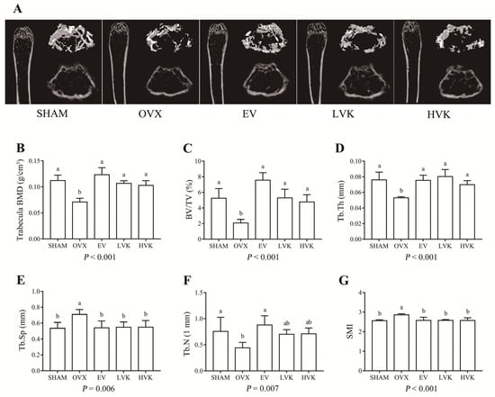Bone microstructures in mice that were sham operated or ovariectomized and untreated or administered EV, LVK, or HVK for 12 weeks. Representative micro-CT images of the 3D reconstruction of distal femurs and cross sections (A). Quantitative analysis of the BMD, BV/TV, Tb.Th, Tb.Sp, Tb.N, SMI of trabecular bone by micro-CT (B–G). Values are mean ± SD, n = 5 per treatment. Labeled without a common letter means a significant difference, p < 0.05. BMD, Bone mineral density; BV/TV, percent bone volume; EV, estradiol valerate; HVK; MK-4 40 mg/kg body weight group; LVK, MK-4 20 mg/kg body weight group; MK-4, menaquinone-4; OVX, ovariectomized group; SD, standard deviation; BMD, bone mineral density; BV/TV, percent bone volume; Tb.Th, trabecular thickness; Tb.Sp, trabecular separation; Tb.N, trabecular number; SMI, structure model index.