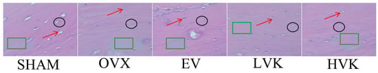 HE staining of compact bone in mice that were sham operated or ovariectomized and untreated or administered EV, LVK, or HVK for 12 weeks. n = 5 per treatment. The red arrows indicate bone cells, the black circles indicate the lacunae and bone matrix, and the green rectangles show osteone. EV, estradiol valerate; HVK; MK-4 40 mg/kg body weight group; LVK, MK-4 20 mg/kg body weight group; MK-4, menaquinone-4; OVX, ovariectomized group.