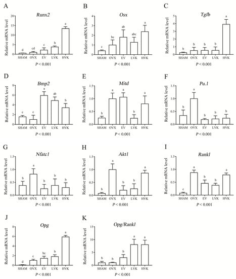 Genes related to bone formation and bone resorption in mice that were sham operated or ovariectomized and untreated or administered EV, LVK, or HVK for 12 weeks. The mRNA expression of Runx2 (A), Osx (B), Tgfb (C), Bmp2 (D), Mitd (E), Pu.1 (F), Nfatc1 (G), Akt1 (H), Rankl (I), Opg (J), Opg/Rankl (K). Values are mean ± SD, n = 5–6 per treatment. Labeled without a common letter means a significant difference, p < 0.05. EV, estradiol valerate; HVK; MK-4 40 mg/kg body weight group; LVK, MK-4 20 mg/kg body weight group; MK-4, menaquinone-4; OVX, ovariectomized group; SD, standard deviation.