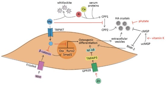 A simplified schematic representation of the processes under investigation leading to the osteogenic differentiation of VSMCs in vascular calcification. Magnesium (Mg) acts at the extracellular level by preventing the maturation of calciprotein particles (CPPs) and by forming whitlockite crystals with phosphate ions (Pi). At the intracellular level, Mg decreases the expression of osteogenic genes (such as Osterix, Smad1, and Runx2) and inhibits pro-calcific pathways (including Wnt/β-catenin). Zinc (Zn) induces the suppression of NF-κB through the activation of the GPR39/TNFAIP3 signaling pathway. Vitamin K promotes the carboxylation and activation of the matrix Gla protein (MGP), which avoids the formation of hydroxyapatite (HA) crystals and prevents the pro-calcific action of BMP-2. Phytate acts as crystallization inhibitor by binding to HA crystals. The regular arrow denote “activation”, and the T-shaped arrow stands for “inhibition”.