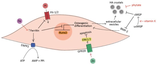 A simplified schematic representation of the processes under investigation leading to the osteogenic differentiation of VICs in vascular calcification. Iron (Fe) acts at the intracellular level via ferritin, which prevents phosphate uptake and inhibits VICs osteogenic differentiation. Moreover, ferritin promotes the production of anti-calcific pyrophosphate (PPi) from ATP by activating the enzyme ENPP2. Zinc (Zn) induces VICs apoptosis through the activation of the GPR39-ERK1/2 signaling pathway. Vitamin K promotes the carboxylation and activation of matrix Gla protein (MGP), which avoids the formation of hydroxyapatite (HA) crystals and prevents the pro-calcific action of BMP-2. Phytate acts as crystallization inhibitor by binding to HA crystals. The regular arrow denotes “activation”, and the T-shaped arrow stands for “inhibition”.