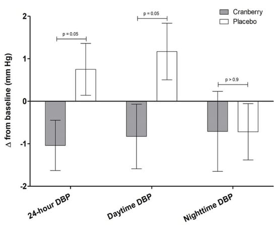 There were no significant main effects of treatment for the primary endpoint of central systolic blood pressure, central or brachial diastolic blood pressure, nor for any other measures of brachial or central blood pressure, augmentation index, and pulse wave velocity (Table 2). Cranberry supplementation significantly reduced ambulatory diastolic blood pressure compared to the placebo (mean difference = −1.79 ± 0.9 mm Hg; p = 0.05), with the change occurring during awake, daytime hours (mean difference = 2.0 ± 1.0 mm Hg; p = 0.05) and not during the nighttime period (p > 0.9) (Figure 2). Cranberry juice did not alter any other ambulatory blood pressure values.