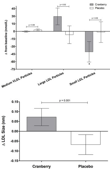 Lipoprotein subfractions, defined according to particle size and density, may provide additional insight into CVD risk but do not serve as a replacement for the standard lipid risk factors [58,59,60,61]. With regard to cranberries, supplementation with cranberry juice was found to increase apolipoprotein A-I and decrease apolipoprotein B in patients with type 2 diabetes [15]. We found that cranberry juice significantly increased the concentration of large LDL particles and decreased overall LDL size. This occurred in conjunction with a decrease in small LDL particles compared to baseline, although the main effect of treatment compared to the control did not reach statistical significance (p = 0.09). However, given the evidence that LDL size may be a significant factor in assessing CVD risk [58,59], further research into the effects of cranberries on lipoprotein subfractions is warranted.