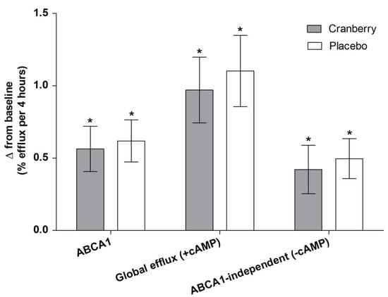 Change in ex vivo measures of HDL-C efflux following supplementation. Change scores were calculated by subtracting study-entry baseline values from each post-supplementation measure. Values are means ± SEM (n = 40; 25 M, 15 F) and were compared using the MIXED models procedure (SAS version 9.4; SAS Institute Inc., Cary, NC, USA) to test the effects of treatment, period, and treatment by period interactions. Baseline values were included as covariates for each endpoint. * indicates a significant change from baseline (p < 0.05).