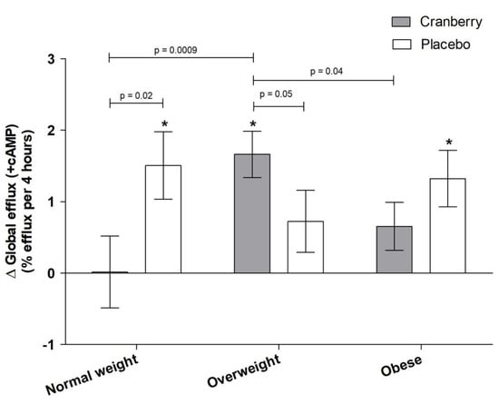 Exploratory subgroup analyses according to BMI category identified a significant interaction between treatment and BMI for global HDL efflux (+cAMP) (interaction p-value = 0.02; Figure 5). Post hoc comparisons demonstrated that cranberry juice supplementation was more effective in participants with overweight compared to both individuals of normal weight and individuals with obesity (p = 0.009 and p = 0.04, respectively). Cranberry juice also significantly increased global HDL efflux (+cAMP) compared to the placebo in individuals with overweight (p = 0.05), whereas there was a greater increase with the placebo in participants of normal body weight (p = 0.02). There was no significant difference between the effect of cranberry juice and placebo in individuals with obesity. There was not a significant interaction between treatment and BMI category for other measures of HDL efflux (data not shown; p > 0.05).
