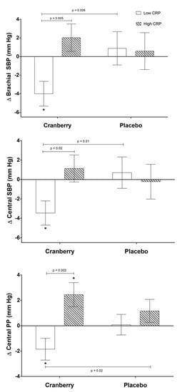 Exploratory secondary analyses revealed significant differences in the effect of supplementation depending on baseline CRP status (defined as high or low compared to the median baseline CRP value of 1.3 mg/L). Baseline characteristics for participants according to CRP status are provided in Table S3. With respect to measures of vascular function, there was a significant treatment by CRP interaction for brachial systolic blood pressure (p = 0.001), central systolic blood pressure (p = 0.03), and central pulse pressure (p = 0.009) (Figure 6). In post hoc analyses, there was a clear distinction in the effect of cranberry supplementation depending on CRP status, with a 4.8% decrease in brachial SBP, 4% decrease in central SBP, and 12% decrease in central PP in individuals with low CRP compared to individuals with high CRP.