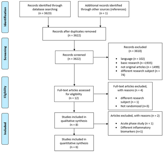 The PRISMA Checklist for the present systematic review and meta-analysis is presented in Table S1. Three thousand six hundred and twenty-three (3623) studies were identified through a systematic search. The flow chart for study selection is shown in Figure 1. Eight studies [13,27,37,38,39,40,41,42] met the inclusion criteria for examining the effect of sodium intake on circulating inflammatory biomarkers and were included in the systematic review. Detailed descriptive data, as well as results for all the included studies are provided in Table 1 and Table 2.