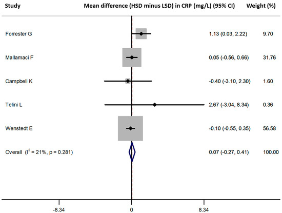 Forest plot of the mean difference in CRP levels for high sodium dose (HSD) versus low sodium dose (LSD), as defined per study [27,37,38,41,42].