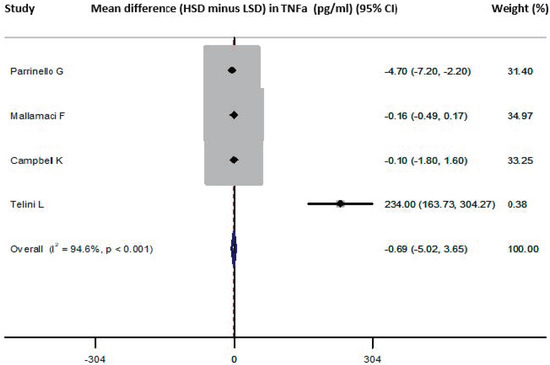 Four studies provided data on the TNF-difference between HSD versus LSD and were included in the meta-analysis [27,37,40,42] (n = 264, weighted age 67.1 ± 8.7 years, men 60%, hypertension 45.8%). They showed that the HSD versus the LSD resulted in a pooled difference in TNF-a values (HSD-LSD) of −0.7 (−5.0, 3.6) pg/mL (Figure 4). No publication bias was identified (all p = NS, Begg’s funnel plot is presented in Figure S1b). Meta-regression analysis did not reveal any significant associations between the difference in TNF-a and male percentage, mean age, duration of intervention and difference in sodium intake between the examined diet arms across the included studies (all p = NS). In a sensitivity analysis excluding the study of Telini et al. [37] (which included patients on hemodialysis and had a parallel arm design), the pooled difference in TNF-a values showed a pooled difference of −1.3 (−3.5, 0.8) pg/mL. Three studies had populations with an average age >55 years [37,40,42] and the pooled difference calculated from these was 2.8 (−7.8, 13.5) pg/mL.