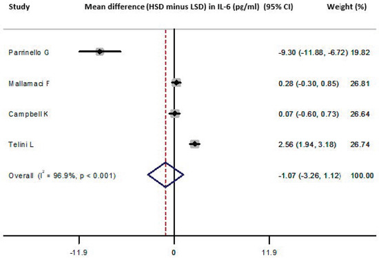 Forest plot of the mean difference in IL-6 levels for high sodium dose (HSD) versus low sodium dose (LSD) as defined per study [27,37,40,42].