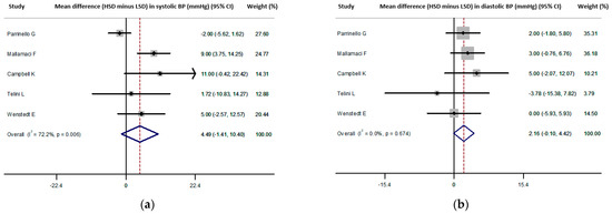 (a) Forest plot of the mean difference in systolic blood pressure (SBP) levels for high sodium dose (HSD) versus low sodium dose (LSD) as defined per study [27,37,40,41,42]. (b) Forest plot of the mean difference in diastolic blood pressure (DBP) levels for high sodium dose (HSD) versus low sodium dose (LSD) as defined per study [27,37,40,41,42].