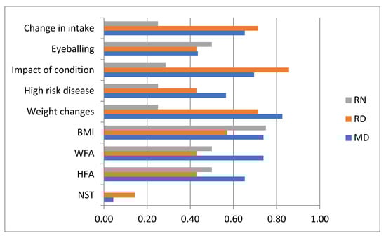 Nutritional screening practices in Canadian tertiary pediatric hospitals by health care profession. RN: registered nurses, RD: registered dietitians, MD: medical doctors, BMI: body mass index, WFA: weight for age, HFA: height for age, NST: nutrition screening tool; results expressed as a proportion of the respondents for this question (n = 59).