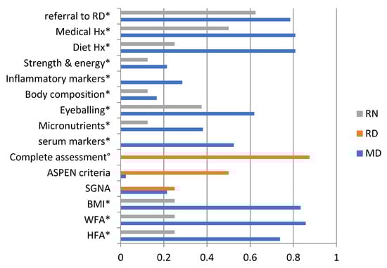 Approaches to nutritional assessment in Canadian tertiary pediatric hospitals by health care profession. RN: registered nurses, RD: registered dietitians, MD: medical doctors, BMI: body mass index, WFA: weight for age, HFA: height for age, SGNA: Subjective Global Nutritional Assessment, Strength and Energy: “Assess strength and energy levels”; * option only available for RN and MD; ° option only available to RD; results expressed as a proportion of the respondents for this question (n = 42), multiple answers were allowed.