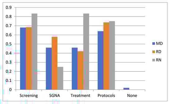 Interests in further nutrition-related education in Canadian tertiary hospitals by health care profession. RN: registered nurses, RD: registered dietitians; MD: medical doctors; SGNA: Subjective Global Nutritional Assessment; results expressed as a proportion of the respondents for this question (n = 42).