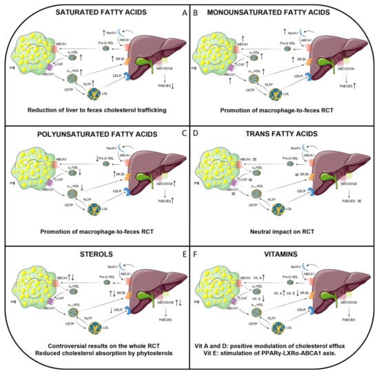 Impact of dietary lipid classes on RCT in animal studies. (A) SFA intake induces an increase in the HDL-C, apoA-I, and HDL transport rate in murine models, in parallel with a reduction in the fractional catabolic rate of HDL. Furthermore, a diet rich in palmitic acid increased PLTP activity in hamsters and SR-BI expression in mice expressing human CETP and apoB100. Overall, dietary SFA reduce cholesterol trafficking from the liver to the feces, negatively impacting on total RCT. (B) MUFA increase HDL-C and apoA-I levels, LCAT activity, and hepatic SR-BI expression in rats, whereas a diet enriched in MUFA did not affect LCAT, CETP, or PLTP expression in hamsters. Moreover, dietary MUFA enhance cholesterol efflux to HDL in C57BL/6 mice, as well as the macrophage-to-feces RCT rate. (C) PUFA intake induces a reduction in the serum HDL concentration in rodents, with a parallel increase in their clearance, probably due to an upregulation of hepatic SR-BI. PUFA, mainly ω-3 PUFA, also enhance macrophage-to-feces RCT in mice, with enhanced biliary secretion and hepatic ABCG5 and ABCG8 expression. (D) A low amount of TFA does not impact on RCT in mice, as demonstrated by unaltered HDL efflux capacity and LCAT activity; similarly, chronic TFA consumption does not affect ABCA1, SR-BI, or HL in rats. However, in hamsters, rumenic acid causes an increase in HDL levels and ABCA1 expression, possibly positively impacting RCT. (E) Sterols. Dietary cholesterol has been to observed both increasing and decreasing the m-RCT process or RCT molecular players such as hepatic ABCG5/G8, ABCA1, SR-BI, and LDLR. On the other hand, the enrichment of diets with phytosterols generated more consistent results, particularly by reducing intestinal absorption and increasing the fecal elimination of cholesterol. (F) Dietary supplementation with either low or high doses of vitamin A results in an increase in SR-BI and ABCA1 expression, resulting in decreased HDL in obese rats. Vitamin D supplementation promotes aorta ABCA1 and ABCG1 expression in hypercholesterolemic swine, suggesting a possible positive modulation of cholesterol efflux. Vitamin E reduces the hepatic expression of SR-BI; moreover, the positive modulation observed on the atherosclerotic lesion area in rabbits or apoE-/- mice may be related to the stimulation of the PPARγ-LXRα-ABCA1 axis. apo: apolipoprotein; CETP: cholesteryl ester transfer protein; HDL: high density lipoprotein; LCAT: lecithin:cholesterol acyltransferase; LXR: liver X receptor; MUFA: monounsaturated fatty acids; PLTP: phospholipid transfer protein; PPAR: peroxisome proliferator-activated receptors; PUFA: polyunsaturated fatty acids; RCT: reverse cholesterol transport; SFA: saturated fatty acids; SR-BI: scavenger receptor class B type 1; TFA: trans fatty acids. Pictures were created by combining images from Smart Servier Medical Art (https://smart.servier.com, accessed on 14 June 2021). Servier Medical Art by Servier is licensed under a Creative Commons Attribution 3.0 Unported License (https://creativecommons.org/licenses/by/3.0/, accessed on 14 June 2021).